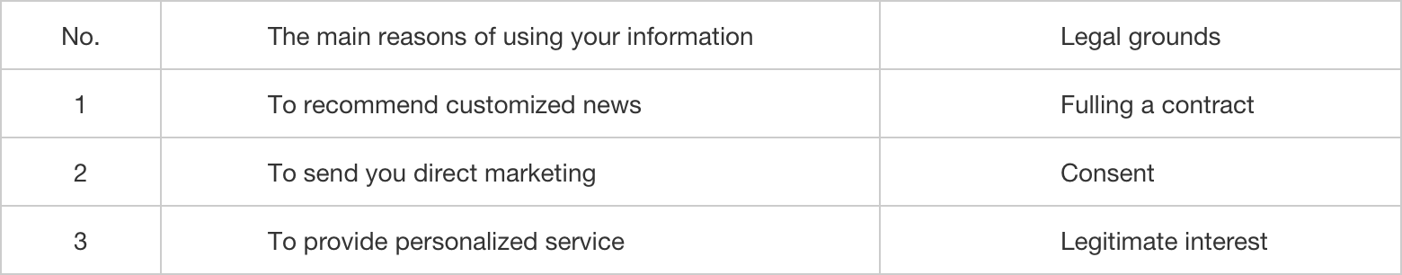 We may use your information where there are legitimate interests to do so. For example, we will analyze your reading habits and preferences to recommend more news to you according to your interests, making our Services more user-friendly.